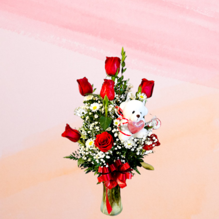 1/2 Dozen of Red Roses with Baby's Breath in Glass Vase, whether you're looking to give thanks, send love, or just let someone know you care. (Plush May Vary)