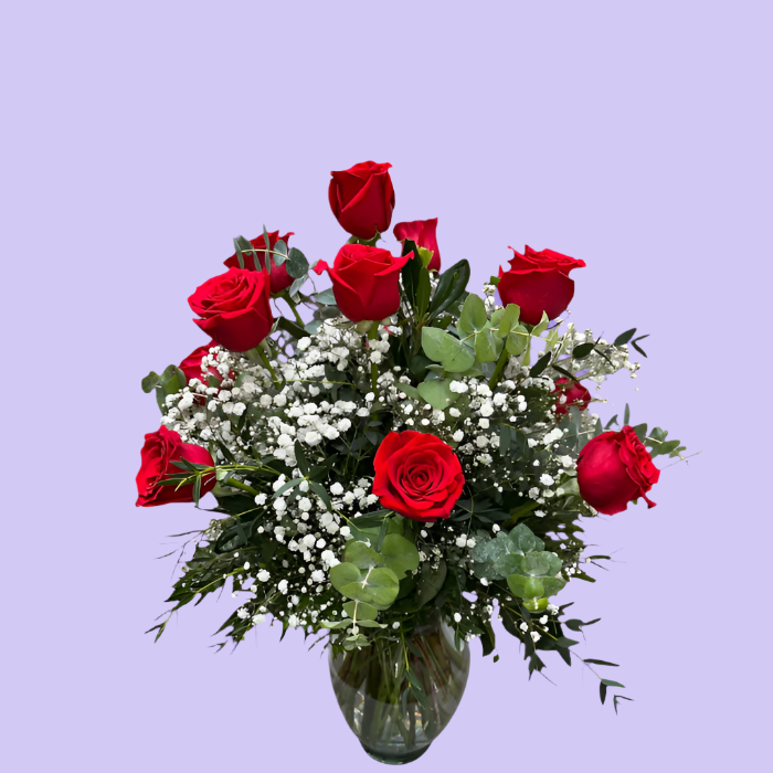 1 Dozen Red Roses Arrangement in Clear Glass Vase.