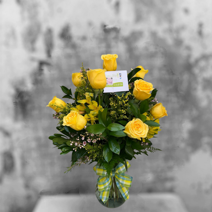 1 Dozen Yellow Roses Arrangement in Clear Glass Vase.