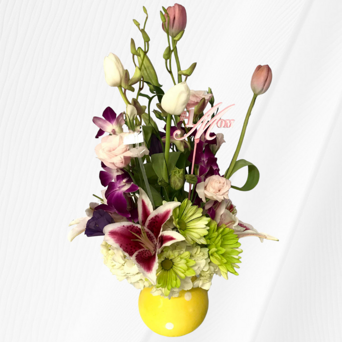Mixed arrangement with daisies, lilies, orchids and tulips vase may vary, whether you're looking to give thanks, send love, or just let someone know you care.