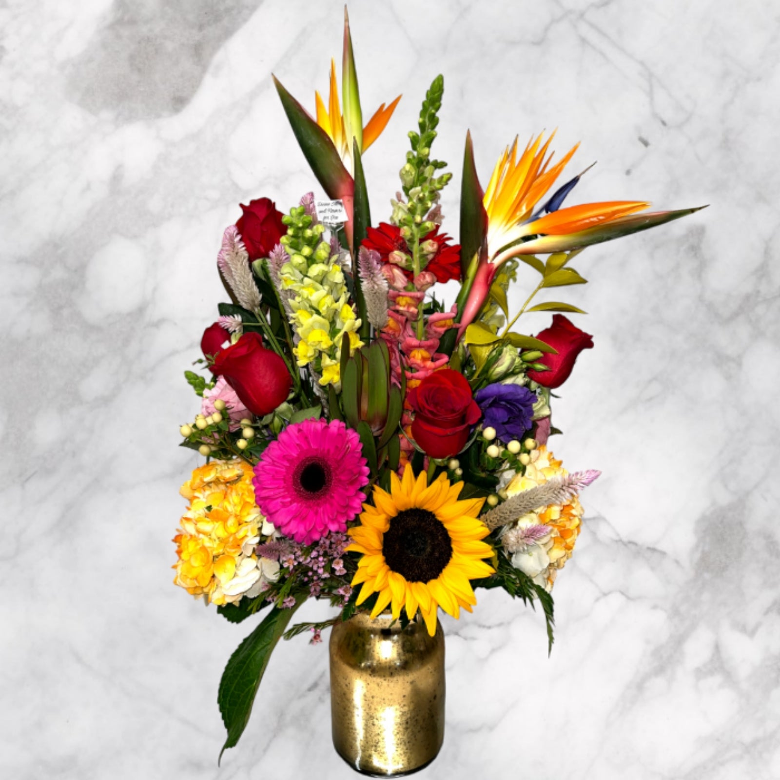 Arrangement with red roses, hydrangeas, sunflower, gerbera daisies, snapdragons and birds of paradise in a gold glass vase, whether you're looking to give thanks, send love, or just let someone know you care.