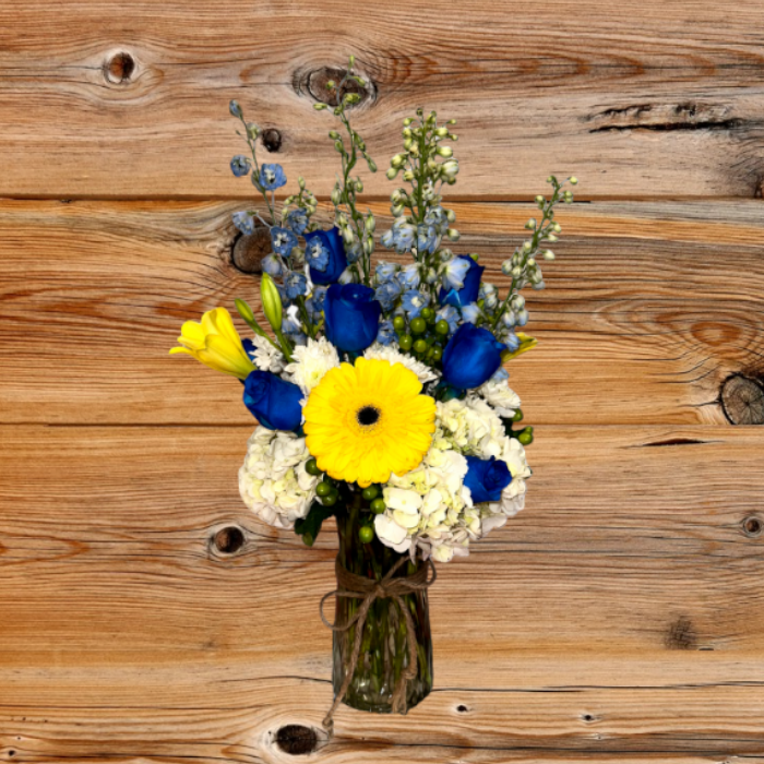 Beautiful Gerbera daisies, Blue roses, Hydrangeas and Delphinium Arrangement, whether you're looking to give thanks, send love, or just let someone know you care.
