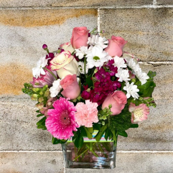 Mixed Daisies, Gerbera Daisy and White and Pink Roses Arrangement in a clear glass cube, whether you're looking to give thanks, send love, or just let someone know you care.