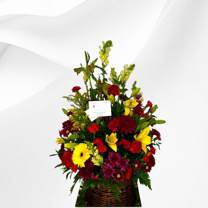 Yellow, Wine and Red Mixed Flower Arrangement in Basket, whether you're looking to give thanks, send love, or just let someone know you care.