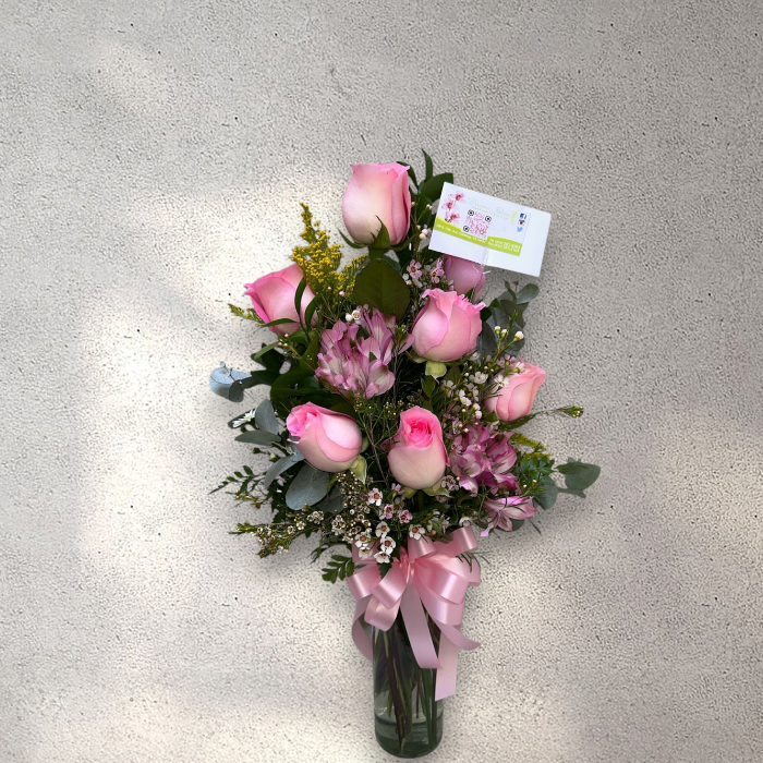 Pink Roses Arrangement in Clear Glass Vase.