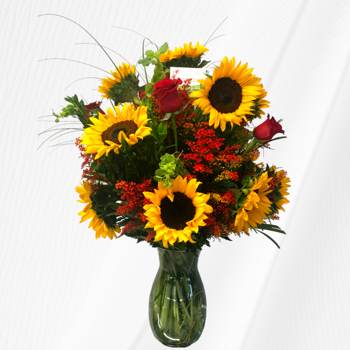 1 Dozen Sunflowers with Red Roses arrangement in glass vase, whether you're looking to give thanks, send love, or just let someone know you care.