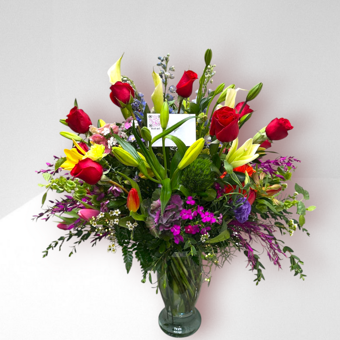 Mixed arrangement with red roses, lilies and tulips in glass vase prefect for home, or office, to express your love.