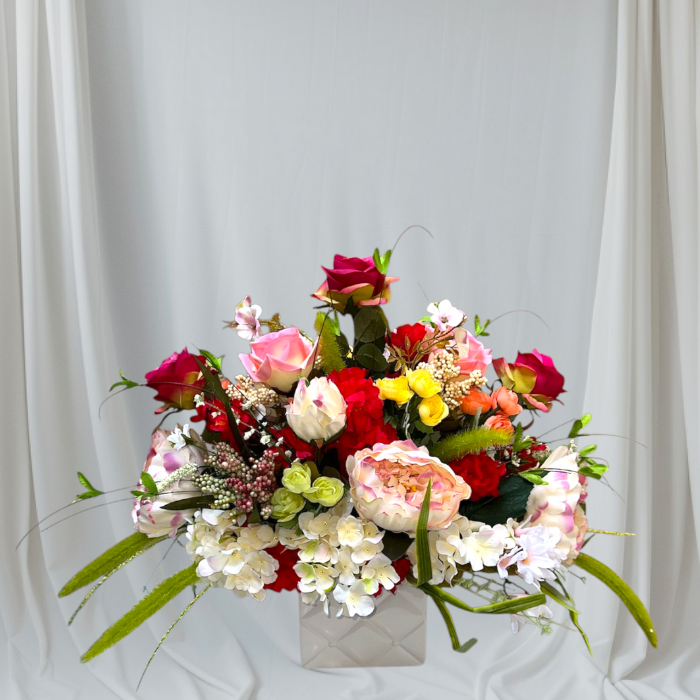 Mixed arrangement in white glass vase prefect for home, or office, to express your love.