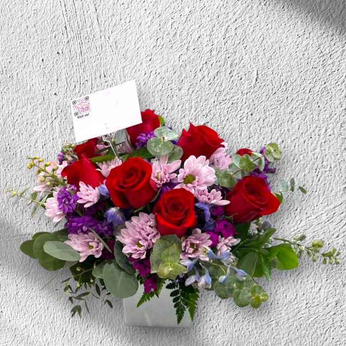 Red Roses with a touch of purple arrangement in a white glass vase prefect for home, or office, to express your love.