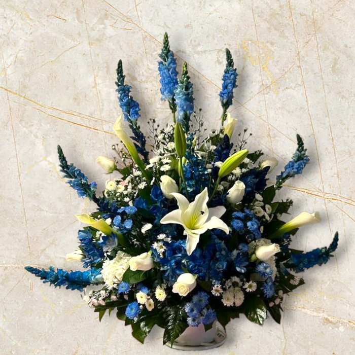 Blue and White Flower Basket Arrangement prefect for service, home, office or church to express your condolences.
