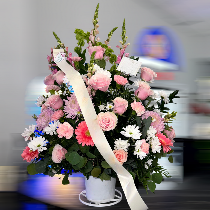 Pink and Light Pink Basket arrangement prefect for service, home, office or church to express your condolences.