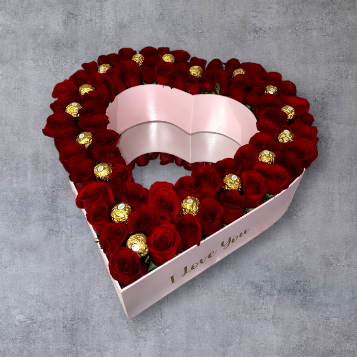 Heart Shape Wooden Box of Red Roses with Fine Hazelnut Chocolates.