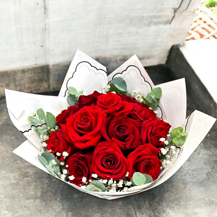 1 Dozen Red Roses with Filler and Greenery Bouquet perfectly wrapped with Korean paper for any occasion. (Color of paper WILL vary)