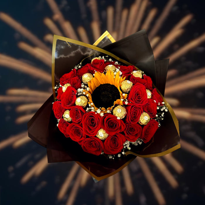 Red Roses Bouquet with One Sunflower, with filler and Hazelnut Chocolates wrapped in paper cellophane. (Color of paper may vary)