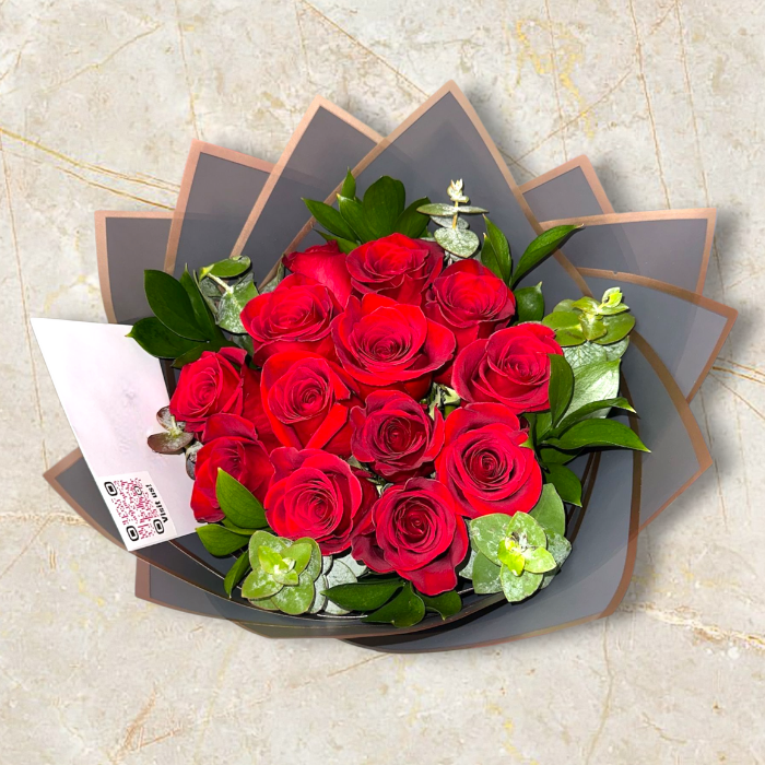 Red Roses with Greenery Bouquet perfectly wrapped with Korean paper for any occasion. (Color of paper may vary)