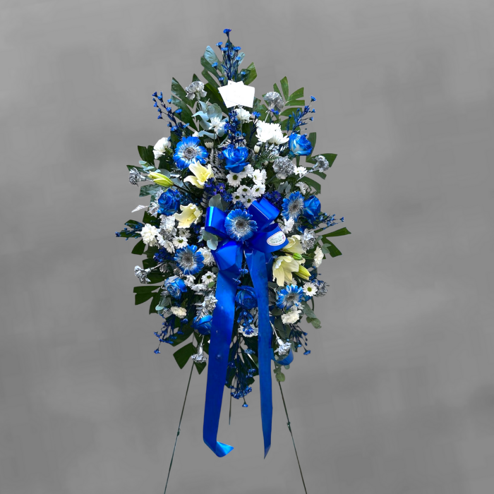 Standing Spray arrangement shades blue, white and silver prefect for service, to express your condolences to your loved ones.