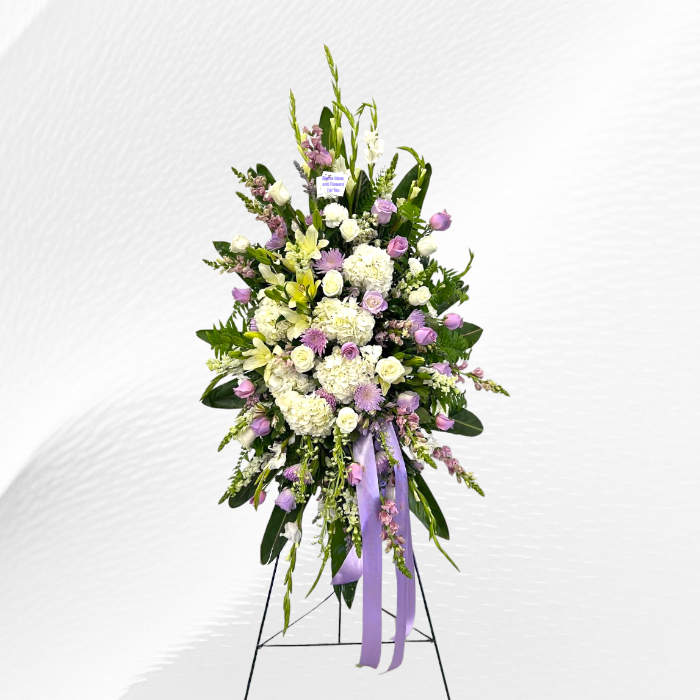 Lavender and White Mixed Standing Spray Arrangement prefect for service, to express your condolences.