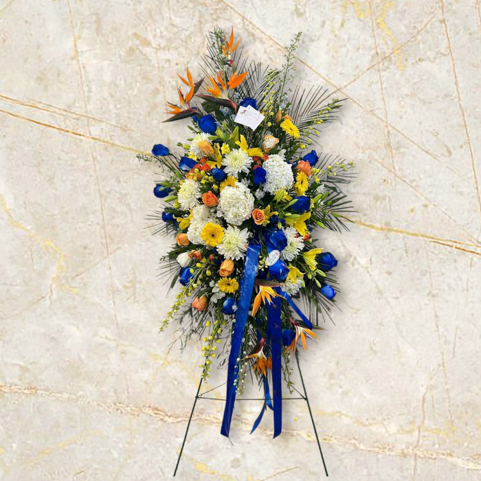 Sympathy Standing Spray Arrangement with hydrangea, spider mum, lilies, birds of paradise and blue roses prefect for service, to express your condolences.