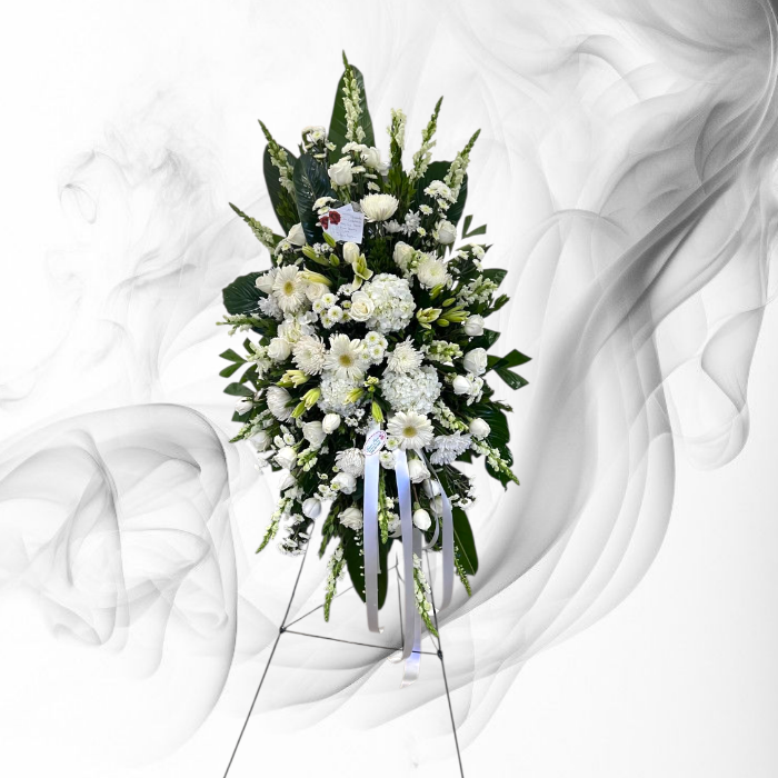 White Standing Spray Arrangement with a mixture of hydrangeas, roses, daisies, gerbera daisies, spider mums and snapdragons make the perfect combination for any service, to express your condolences.