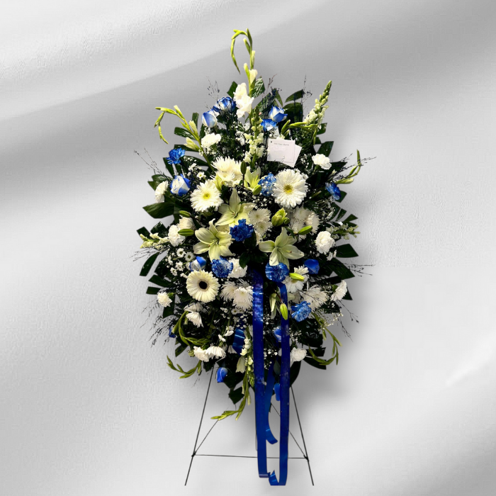White and a touch of Blue Standing Spray arrangement prefect for service, to express your condolences.