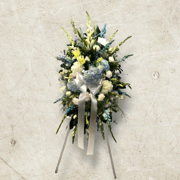 Beautiful White Standing Spray arrangement with a touch of light blue makes the perfect combination for service, to express your sympathies.