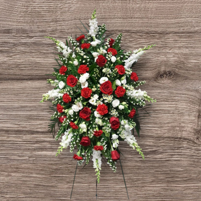 Standing Spray Arrangement with red roses, red carnations, and white snapdragons prefect for any service, to express your condolences.