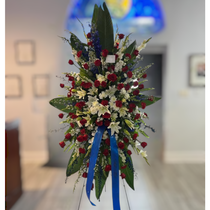 Sympathy Mixed Red, White and Blue ribbon Standing Spray arrangement prefect for service, to express your condolences.