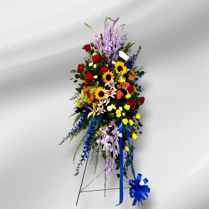 Mixed Gladiolus Standing Spray arrangement with delphinium, sunflowers, red and yellow roses prefect for service, to express your condolences.