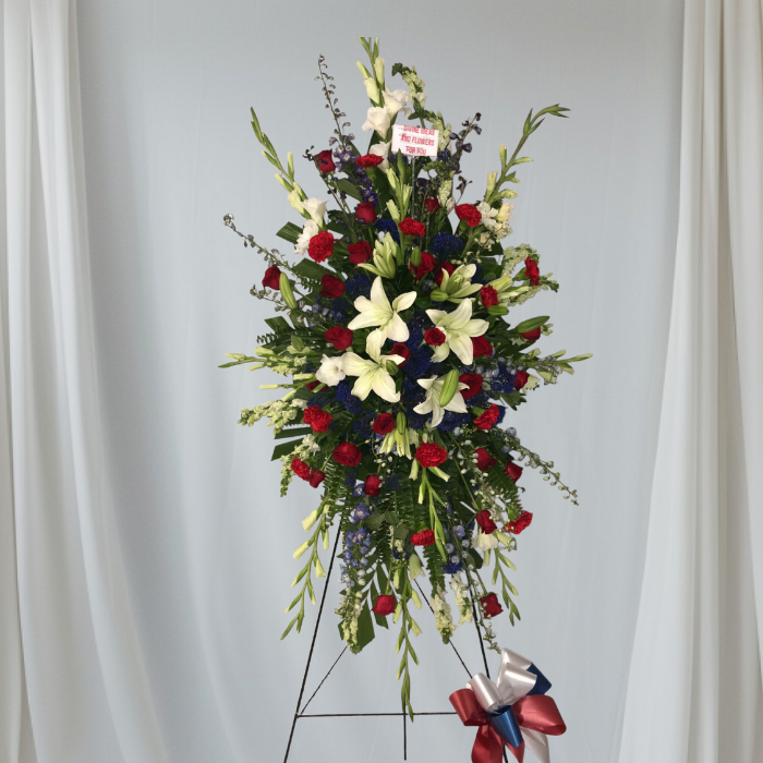 Sympathy with White Gladiolas and Lilies with Red Roses Standing Spray arrangement prefect for any service, to express your condolences.